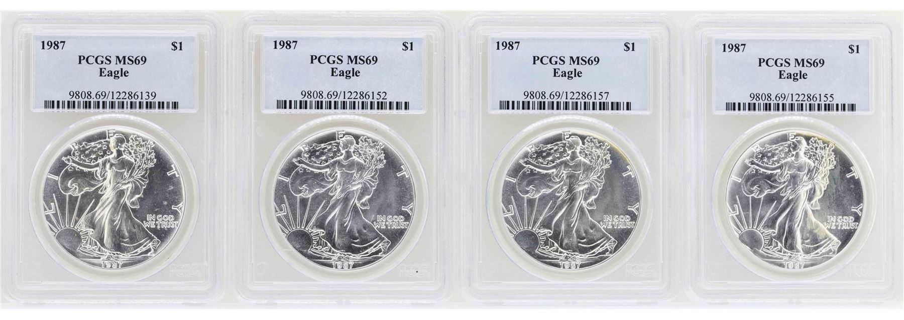 One Lot of (4) 1987 $1 American Silver Eagle Coins PCGS MS69. PCGS Graded.