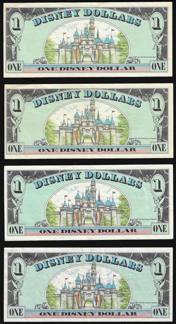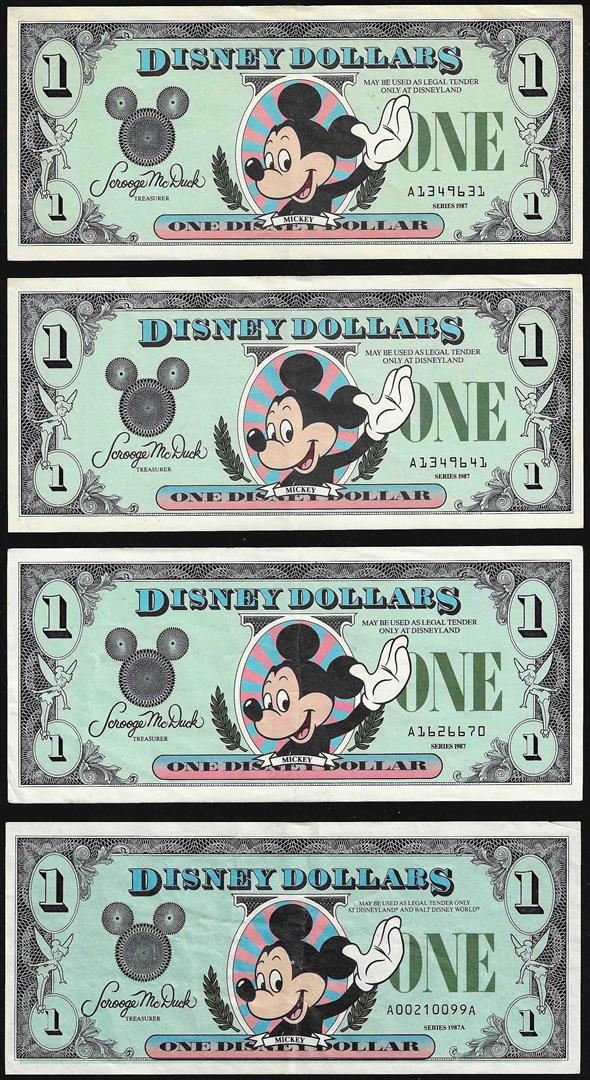 One Lot of (4) 1987 $1 Disney Dollar Notes.