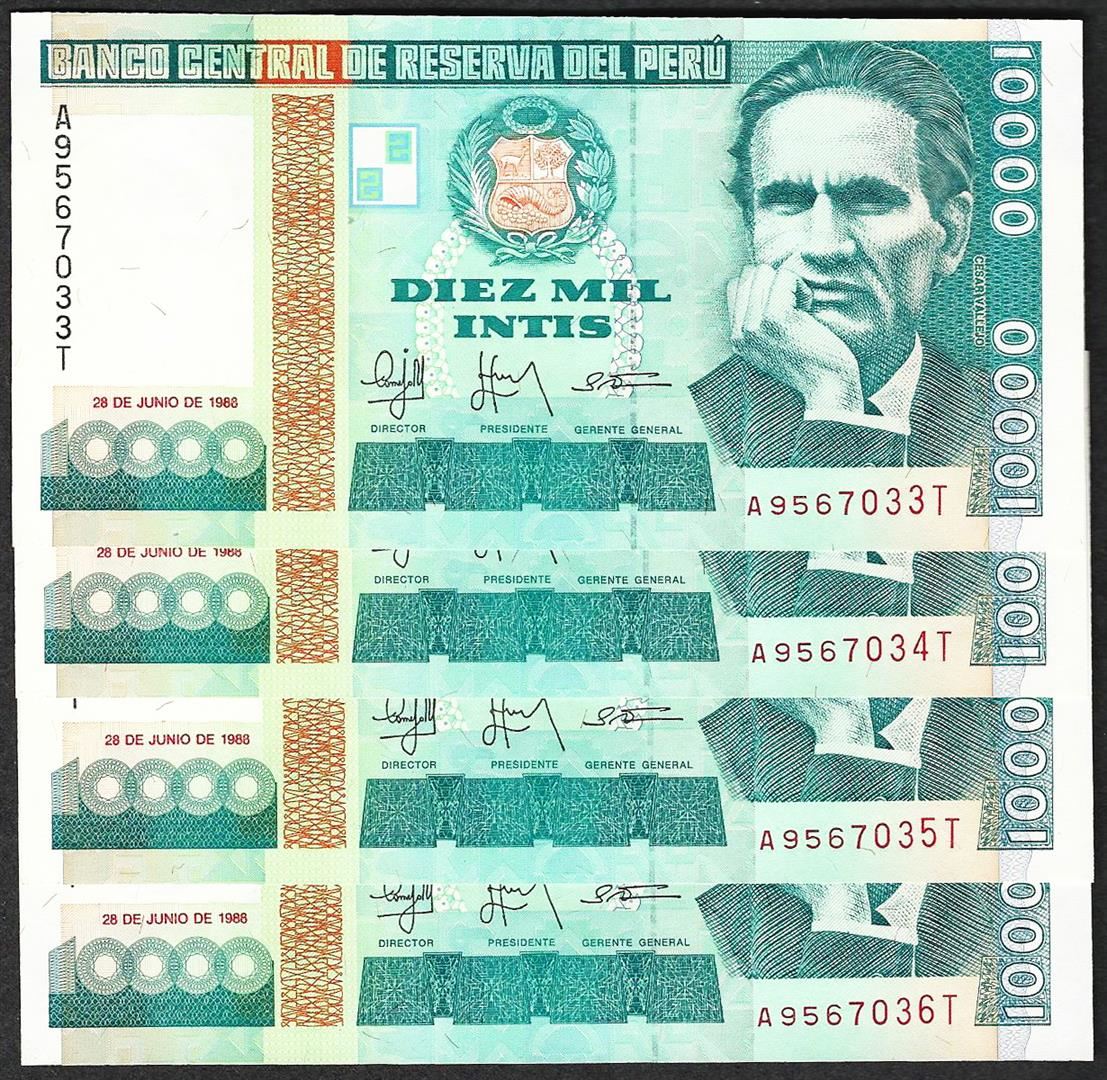 One Lot of (4) 1988 Peru Diez Mil Intis Uncirculated Bank Notes.