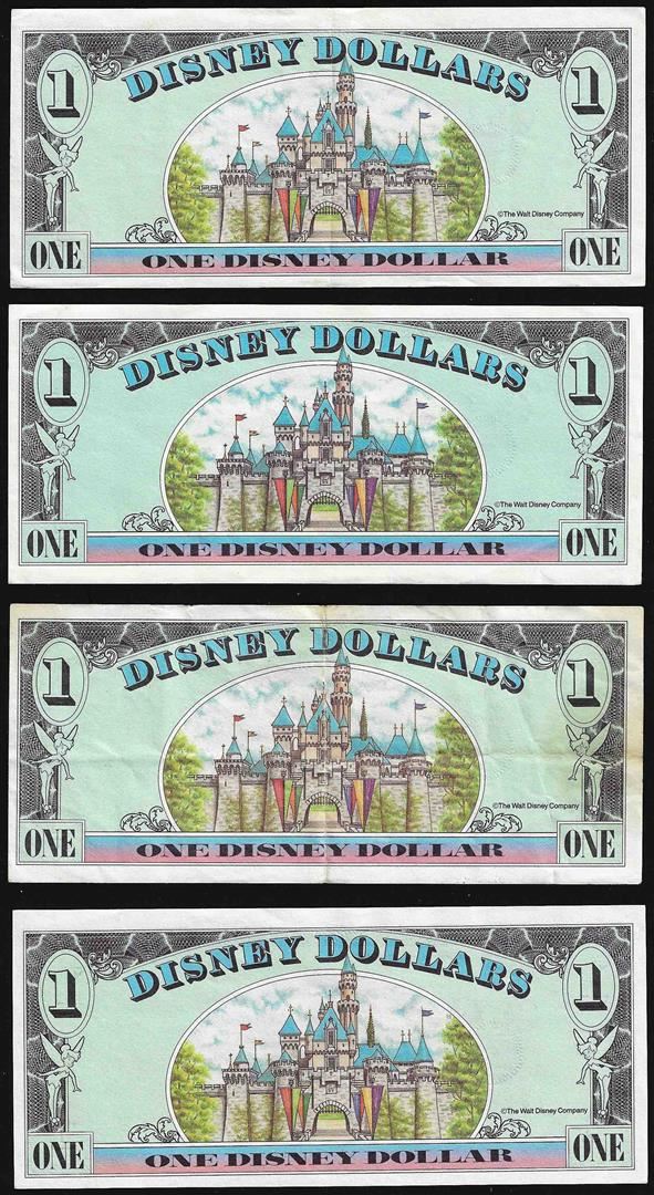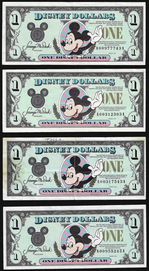 One Lot of (4) 1991 $1 Disney Dollar Notes.