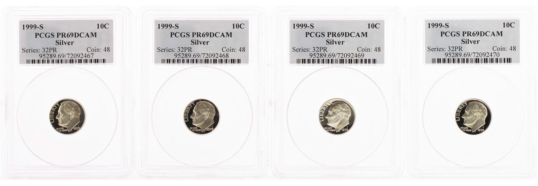 One Lot of (4) 1999-S Proof Silver Roosevelt Dime Coins PCGS PR69DCAM. PCGS Graded.