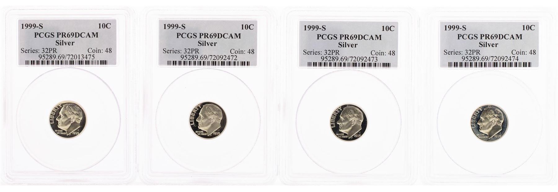 One Lot of (4) 1999-S Proof Silver Roosevelt Dime Coins PCGS PR69DCAM. PCGS Graded.
