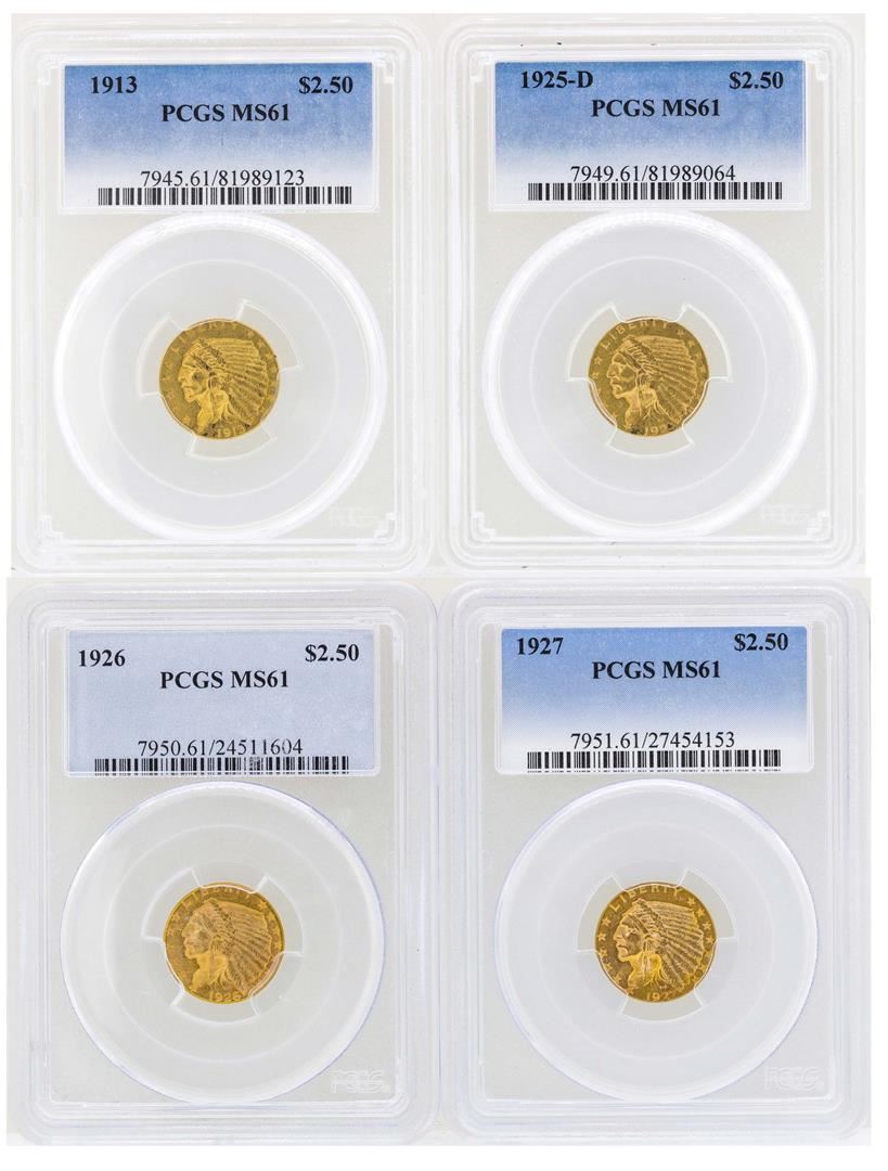 One Lot of (4) $2 1/2 Indian Head Quarter Eagle Gold Coins PCGS MS61. PCGS Graded.