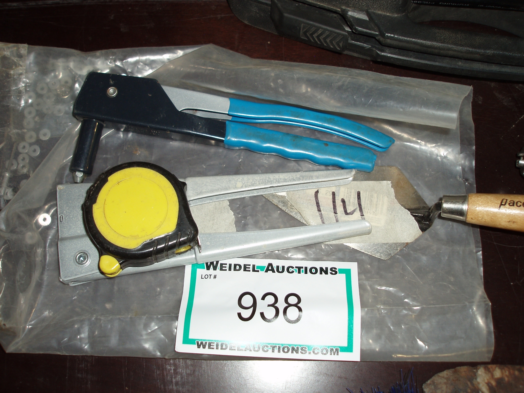 Lot of 4, 2 Rivet Guns, hand trowel & tape measure