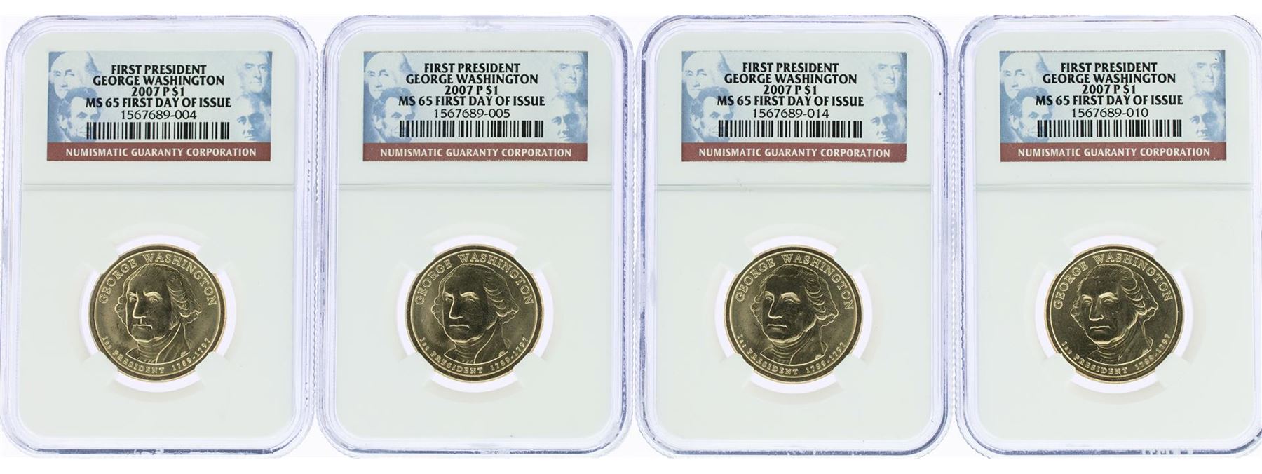 One Lot of (4) 2007-P George Washington Presidential Dollar Coins NGC MS65 FDOI. NGC Certified.