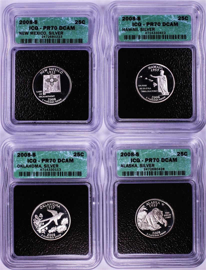 One Lot of (4) 2008-S Proof Silver State Quarter Coins ICG PR70DCAM. ICG Certified.