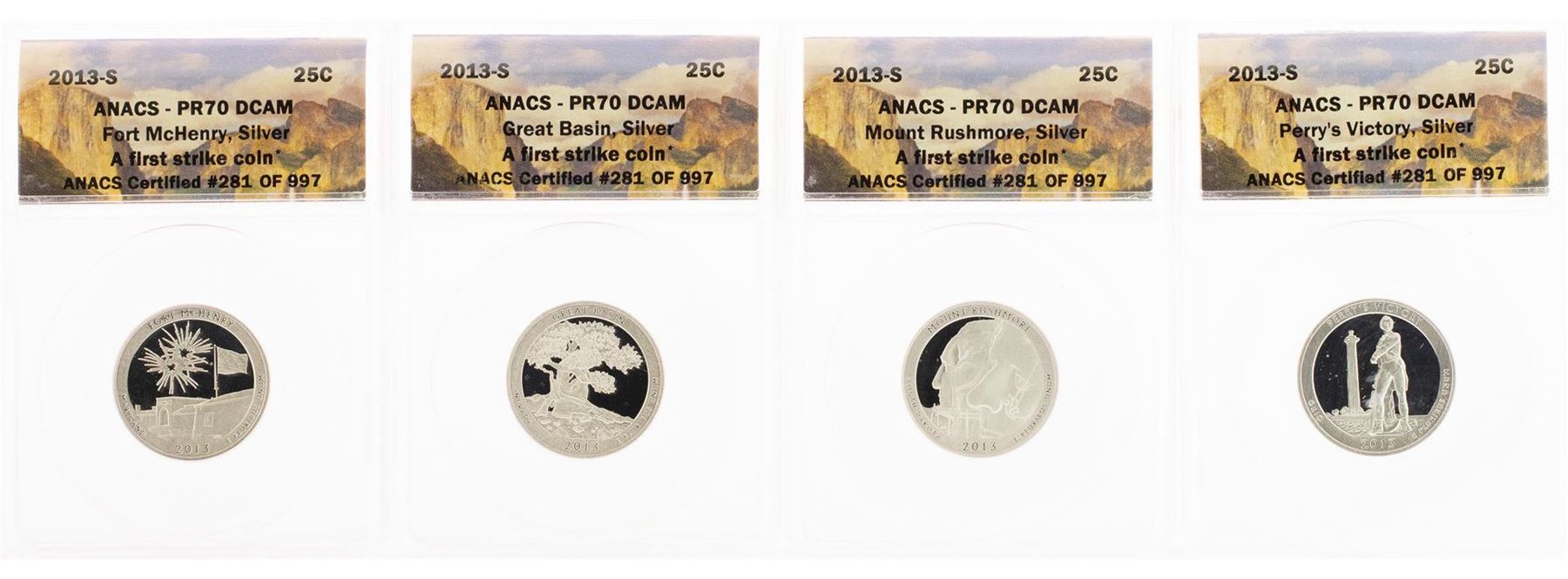 One Lot of (4) 2013-S Proof Silver America Beautiful Quarter Coins ANACS PR70 DCAM. ANACS Certified.