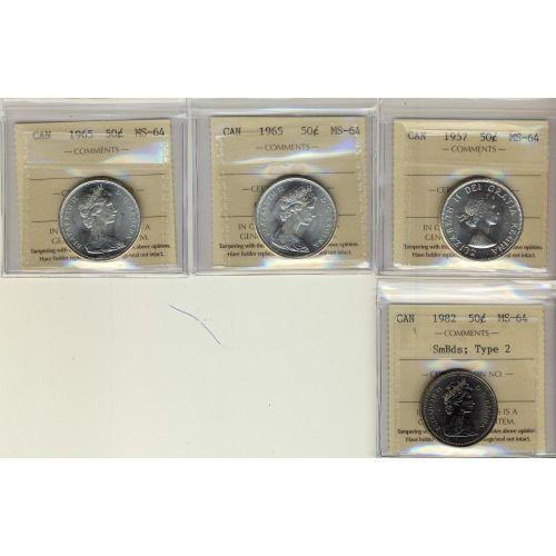 Lot of 4 50¢ ICCS MS64 coins, includes, 1957, 1965(2) and 1982 Type 2.