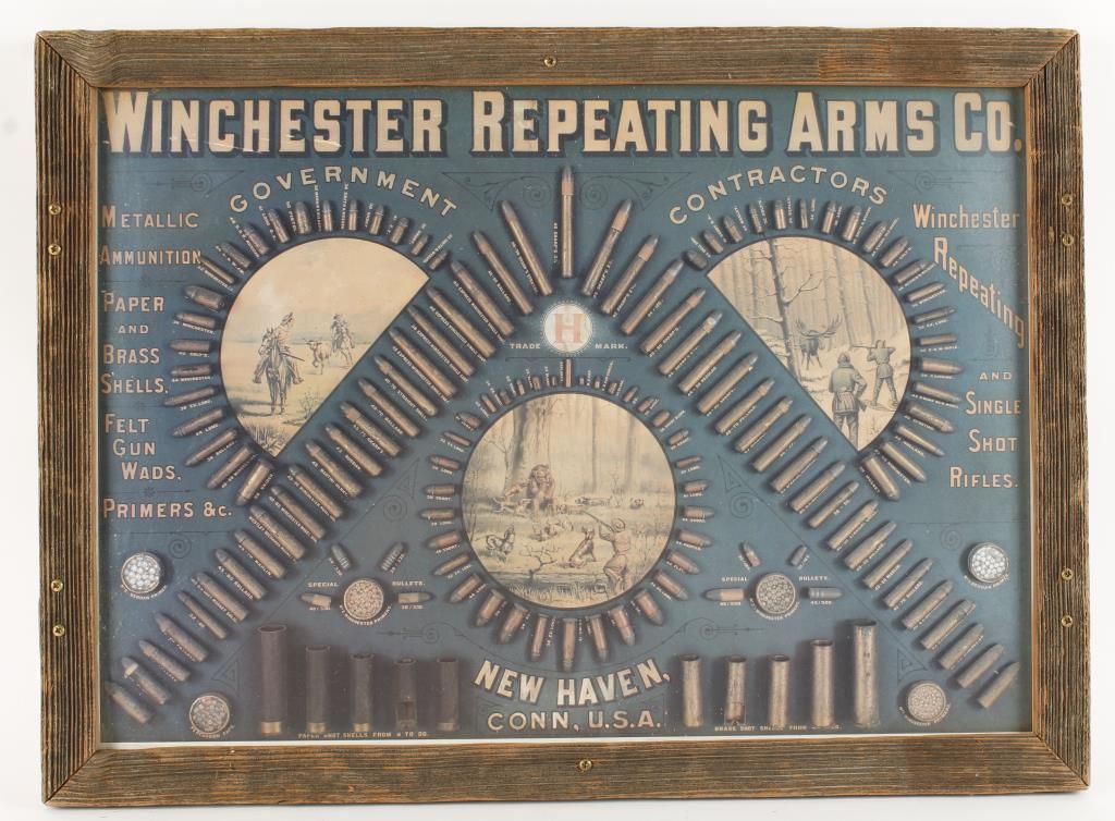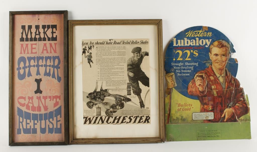 Includes (1)"Make Me An Offer I Can't Refuse" measures 18 1/2"Hx8"W; (1)"Western Lubaloy" .22s Lubricating Alloy cardboard measures 16"Hx12"W; (1)framed newspaper advertisement for Winchester roller skates; and (1)framed Winchester Repeating Arms Co bullet board (no bullets) that measures 19 3/4"Lx14"H.