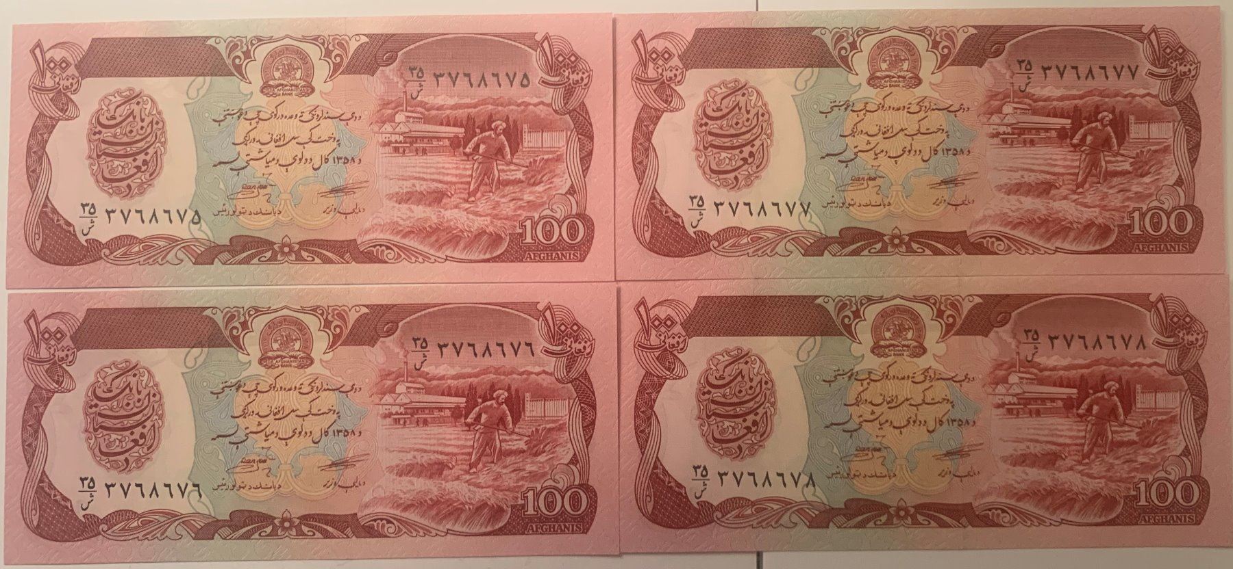 Lot of 4 Afghanistan 100 Afghanis 1979 58a UNC Sequential Serial 35/CH 3768675 to 35/CH 3768678