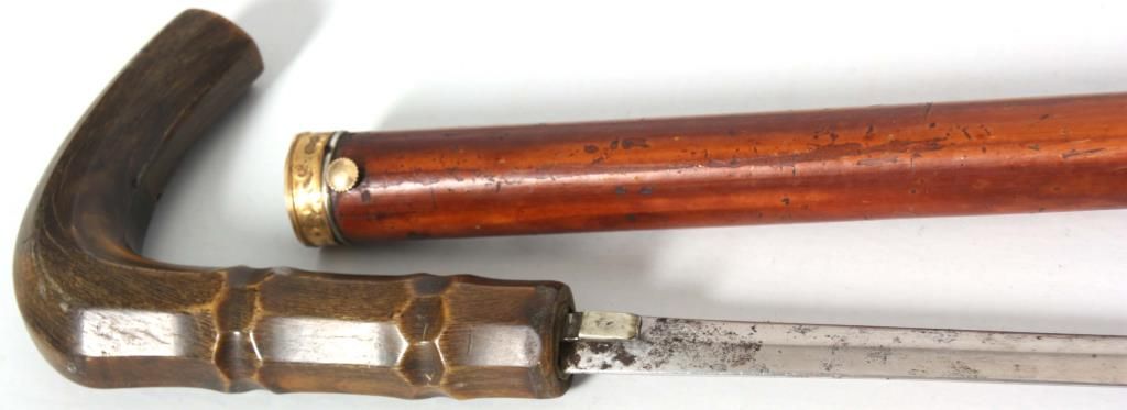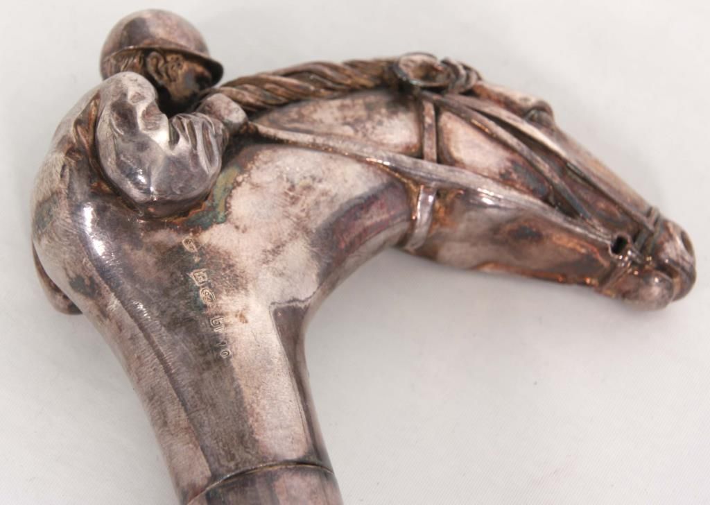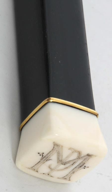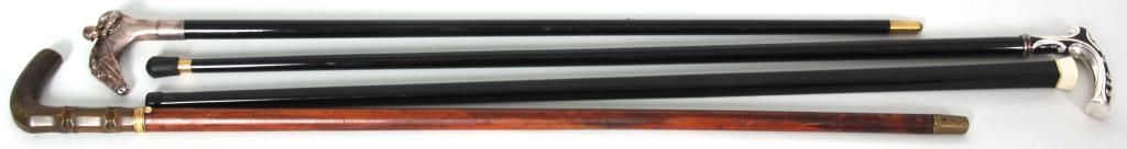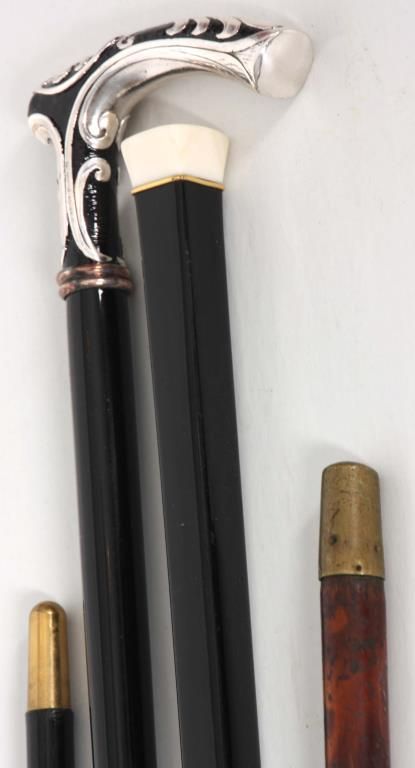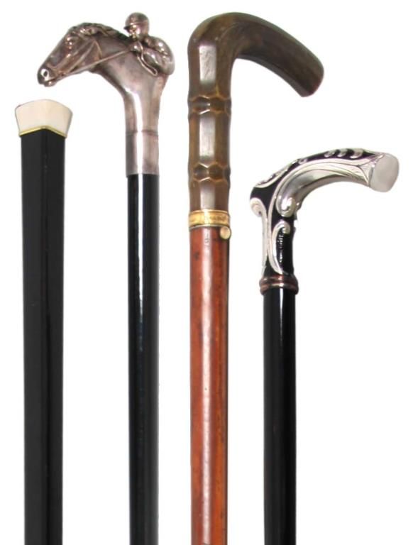 Lot of 4 Antique Canes. Sword cane has a tapered wood shaft with brass cap, gold plated collar, steel blade and carved horn handle, 35.5 in. long; Italian cane has a marked 925 sterling silver handle with black enamel highlights, gilt brass tip and long ebonized lacquered wood shaft, 37 in. long; Italian marked 925 sterling silver handle cane with horse and jockey, tapered ebonized lacquered wood shaft and brass tip, 33 in. long; Square tapered lacquered ebonized wood cane with carved ivory finial, monogrammed MP, gold plated collar and baleen tip, 35.5 in. long. Each is in very good condition.
