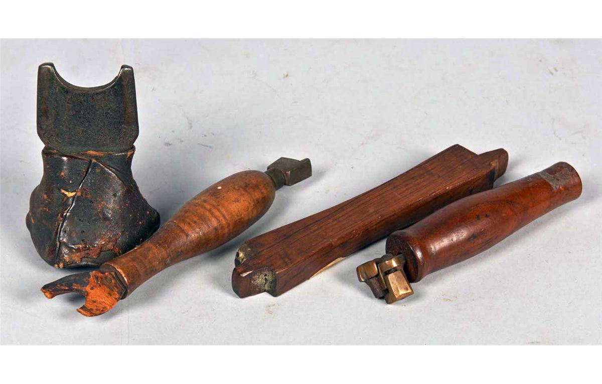 Wood and metal with leather. Some marked with "Beverly Historical Society" tags. Condition (Good). Size Largest: 7" L.