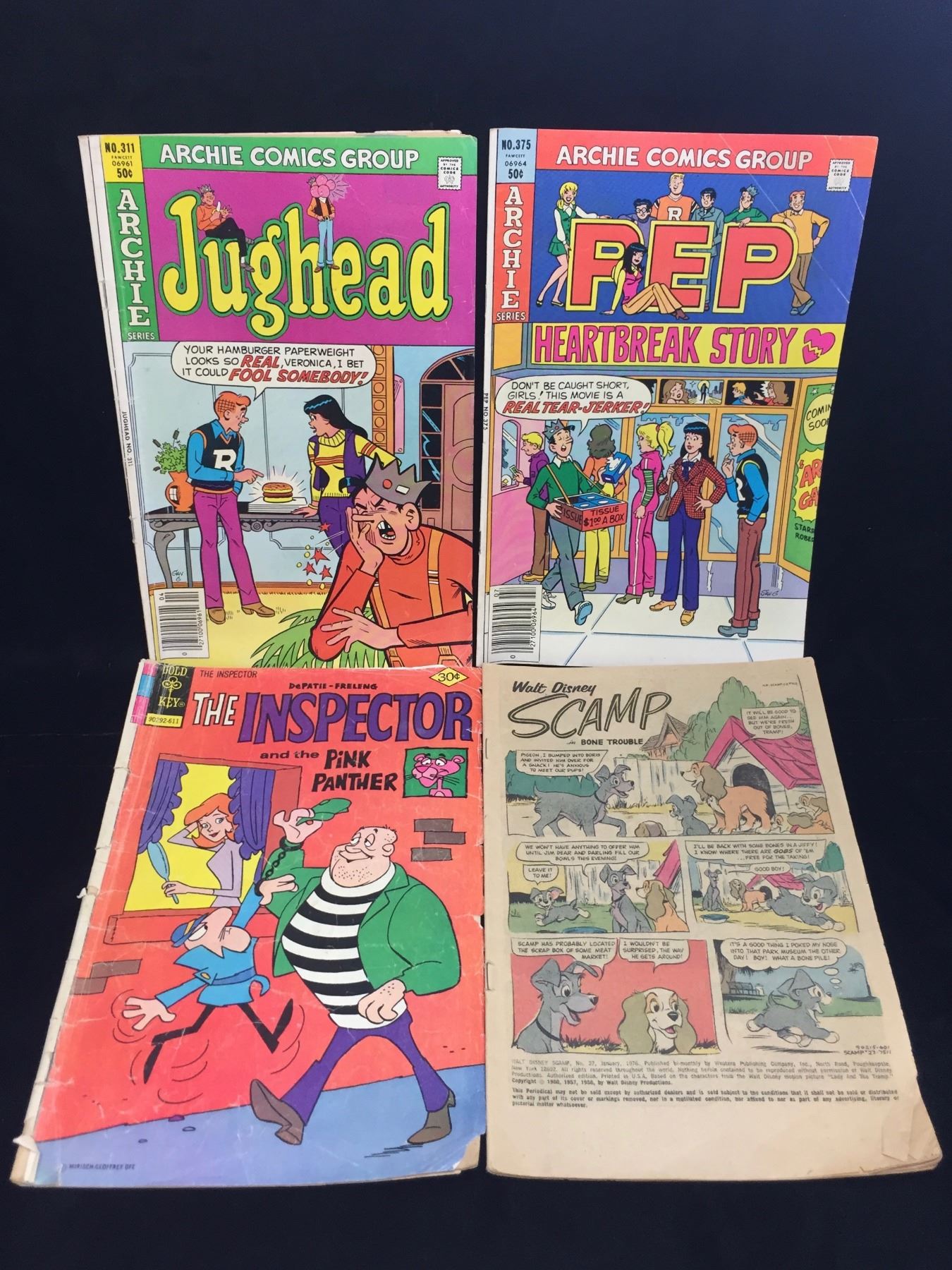 Lot 318; Lot of 4 Comics - Archie, The Inspector, Scamp (Archie, Gold Key, Walt Disney) - #311 Archie Series: Jughead (1981) Condition: Very Good, #375 Archie Series: Pep (1981) Condition: Very Good, #12 The Inspector "And The Pink Panther" (1976) Condition: Fair-Good, #27 Walt Disney: Scamp (1976) Condition: Missing Front and Back Cover, Rest of Comic Is Intact. Comics Are Legiable, Examine Photos Carefully for Condition and Bidding Consideration