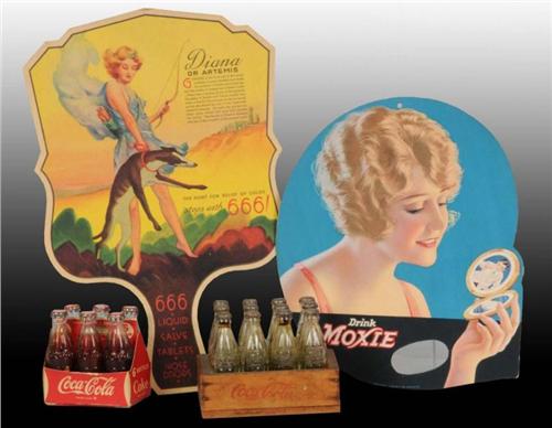 Description 1920s to 1940s. Includes two Coca-Cola miniatures and two hand fans. Minor marks with light soiling and wear. Condition (7.5, Very Good).