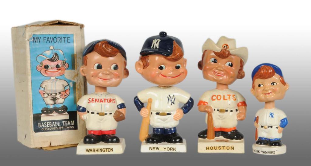 Japanese. Includes white round base mini New York Yankee, regular size white square base New York Yankee, white square base Washington Senator and white square base Houston Colt. Mini Yankee has some restoration to neck, regular-sized Yankee has some restoration to front and back of head, Senator has slight touchup to base and has original box and Colt has minor chipping to back of base. Condition (Very Good). Size Largest: 6 - 1/2" T.