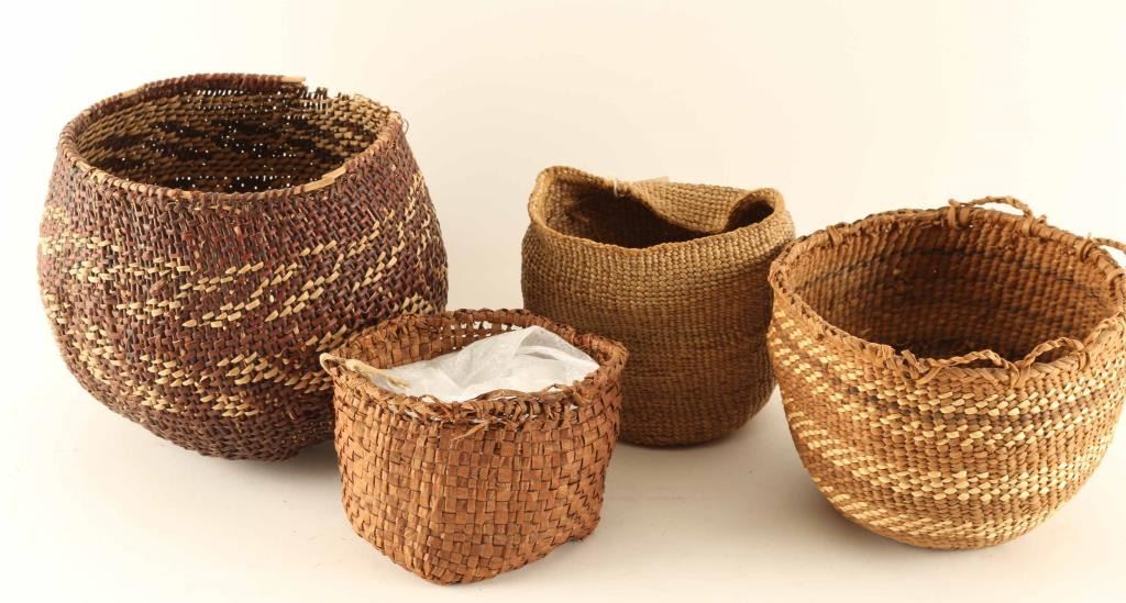 Including; Washington Coastal cedar bark basket circa 1940 measures 4"x4"x4" small losses otherwise good, twisted root bag circa 1940 measures 4"x4 1/2" good condition found at Point Barrow Alaska, Quinalt basket-some loops missing on rim circa 1920 measures 5"x7", and a Maidu Twined basket circa 1920 with serious rim loss measures 6 3/4"x6 3/4".
