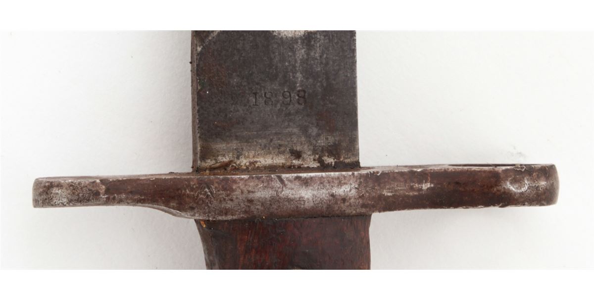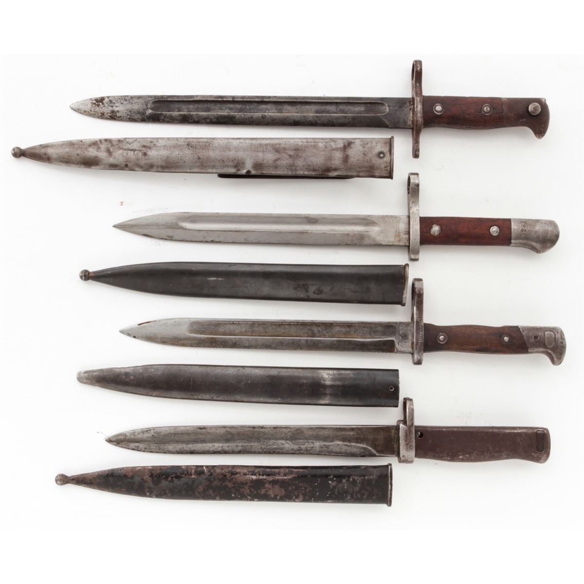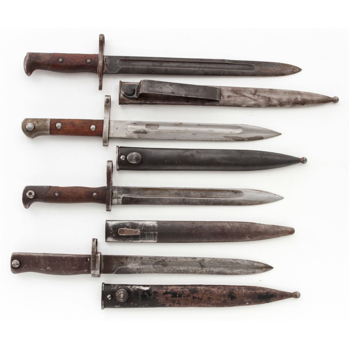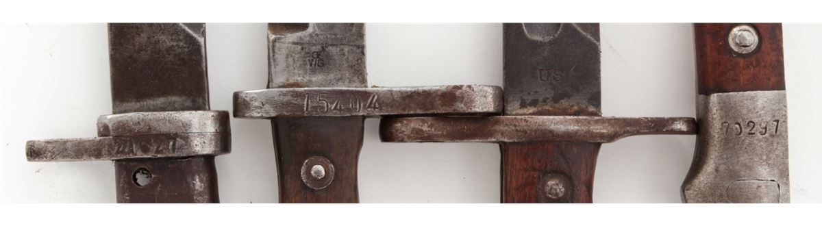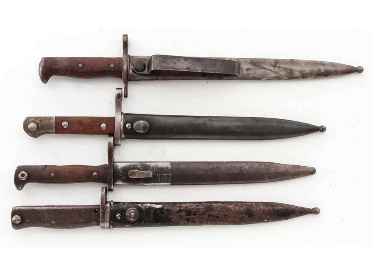 Lot of Four (4) Bayonets: 1.) Bayonet for a Mauser Model 71/84 rifle, Turkish ''A.S.F.A.'' markings on the pommel, with metal scabbard. 2.) German Ersatz bayonet, metal handle, with scabbard. 3.) Model 1892 bayonet for a Krag rifle, dated ''1898'', with metal scabbard and belt hangar. 4.) Turkish Mauser bayonet with metal scabbard. Conditions are good overall showing normal signs of age and wear, including additional sharpening, carbon spotting, oil darkening to wood grips, etc. Scabbard for the Krag bayonet is split along one edge. Est.: $200-$300/lot.