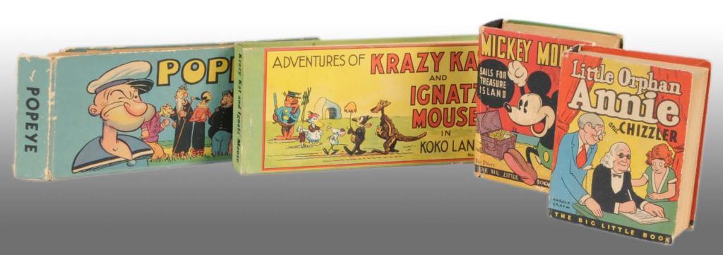 Description 1933 and 1934. Includes "Adventures of Krazy Kat and Ignatz Mouse in Koko Land", "Popeye", "Little Orphan Annie and Chizzler" and "Mickey Mouse Sails for Treasure Island". Cover detached on Popeye. Condition (Fair - Very Good).