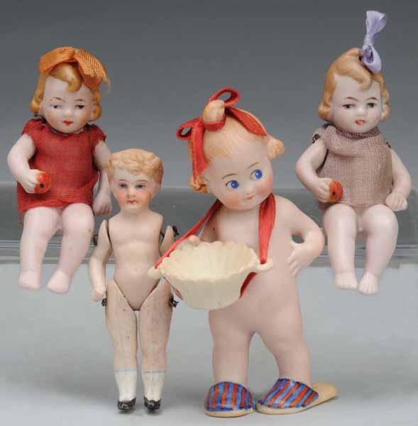 Description Germany, Ca. 1910-1920. Figurine with molded hair and googly eyes, jointed all-bisque with molded hair and painted eyes, two Hertwig girls in sitting position with jointed arms holding apples in their hands, molded loop for hair bow. Condition (Excellent).