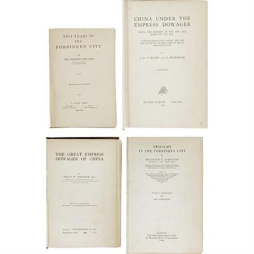 <B>Lot of Four Books on Peking and the Empress Dowager of China.</B></I> The group includes: <BR><B>Philip W. Sergeant.</B></I><B><I> The Great Empress Dowager of China.</B></I></B></I> London: Hutchinson & Company, 1910. First edition Octavo. 344 pages. Original red cloth boards with gilt titles and decoration. Sixteen photographic illustrations. Age darkening to spine, moderate wear to boards, lightly bumped corners, former owner's bookplate on the inside front cover. Very good condition.<BR><BR><B>Princess Der Ling. </B></I><B><I>Two Years in the Forbidden City.</B></I></B></I> London: T. Fisher Unwin, 1912. First English edition. Octavo. 383 pages. Original orange cloth boards with gilt titles. Twenty-two photographic illustrations. Spine faded. One inch tear at the top of the front hinge, inside hinges starting to crack, bumped corners, former owner's bookplate on the inside front cover, contents sound, else good condition.<BR><BR><B>Reginald F. Johnson.</B></I><B><I> Twilight in the Forbidden City.</B></I></B></I> London: Victor Gollancz Ltd., 1934. First edition. 486 pages. Original green cloth boards with gilt titles, forty-three photographic illustrations Spine and periphery of boards faded, corners lightly bumped, inside hinges cracked, former owner's bookplate on the inside front cover, else very good.<BR><BR><B>J.O.P. Bland and E. Backhouse.</B></I><B><I> China Under the Empress Dowager.</B></I></B></I> The History of the Life and Times of Tz'u His.<I> </B></I>Peking: Henri Vetch, 1939. Revised Peking edition. Quarto. 470 pages. Original yellow cloth boards, map endpapers. Thirty-one photographic illustrations, two fold-out maps. Moderate shelf wear to boards, soiling to spine, inside hinges cracked, former owner's bookplate on recto of frontis, internal contents sound and tight, very good condition.<BR><BR><b>Shipping:</b> Books & Catalogs (<a target="_blank" href="http://www.heritageauctions.com/common/shipping.php">view shipping information</a>)