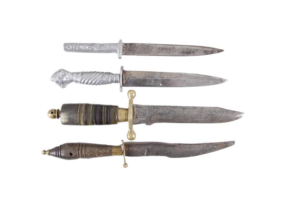 Lot of 4 Bowie Knives 3 are Mexican and 1 Korium is made in Germany, shows heavy pitting and age.3 are Mexican and 1 Korium is made in Germany, shows heavy pitting and age.