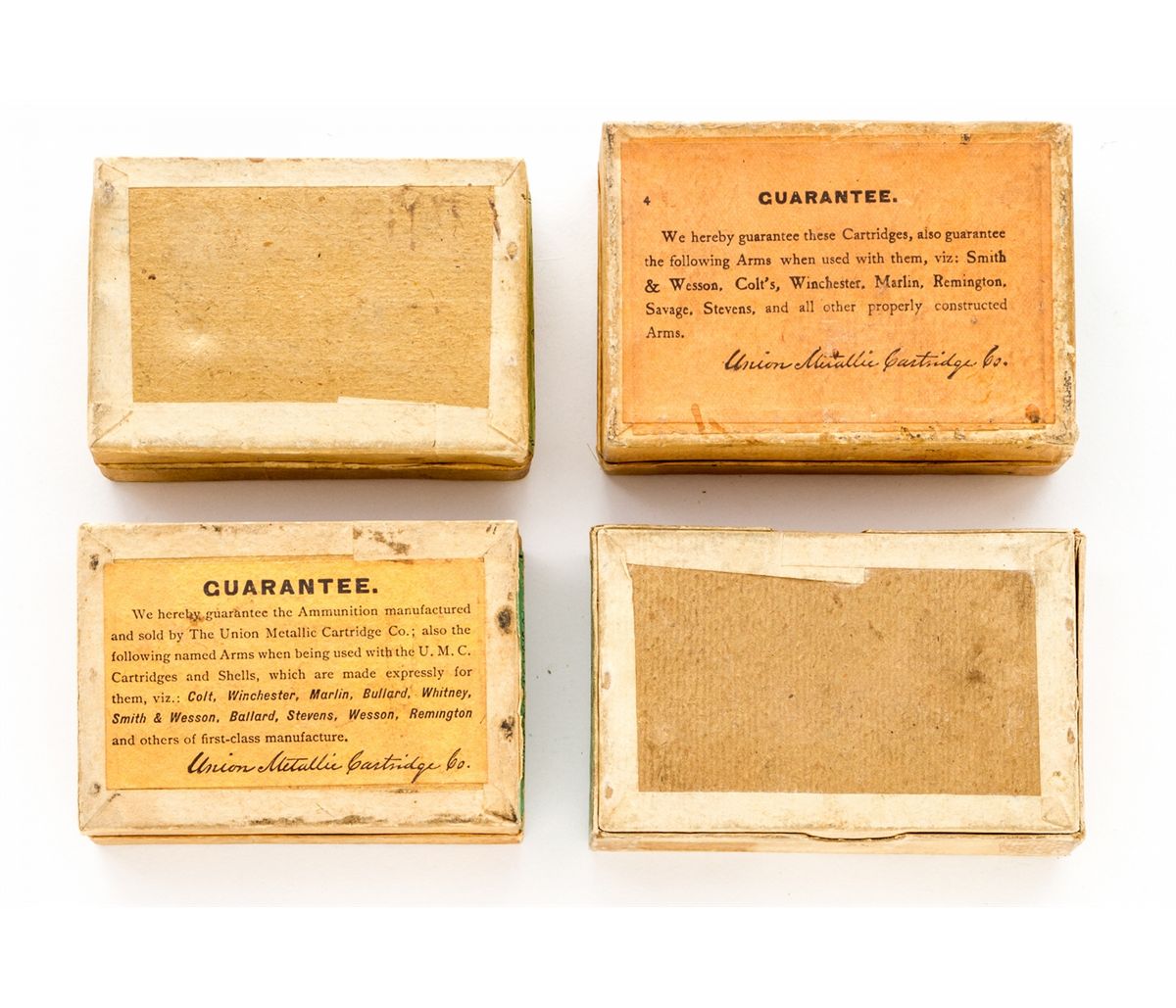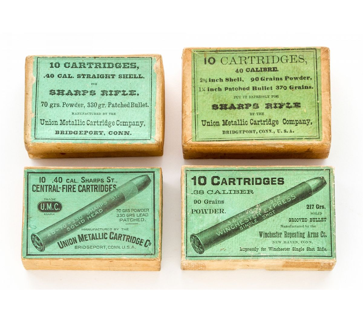 Lot of Four (4) Different Boxes of Green Labeled Ammunition for Sharps Rifles: (1) By UMC, .40-70-330. (2) By UMC, .40-90-370. (3) Somewhat later by UMC, .40-70-330. (4) By Winchester, .38-90-217. All appear complete and in fine condition with vivid labels. Est.: $400-$600/lot.