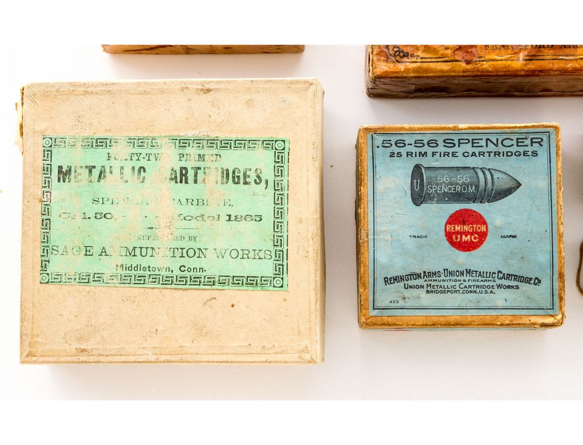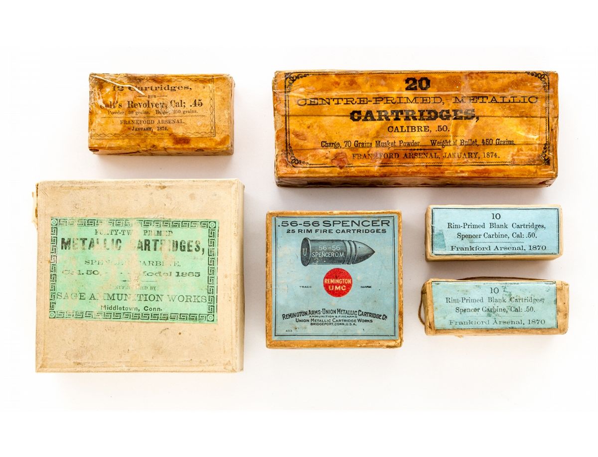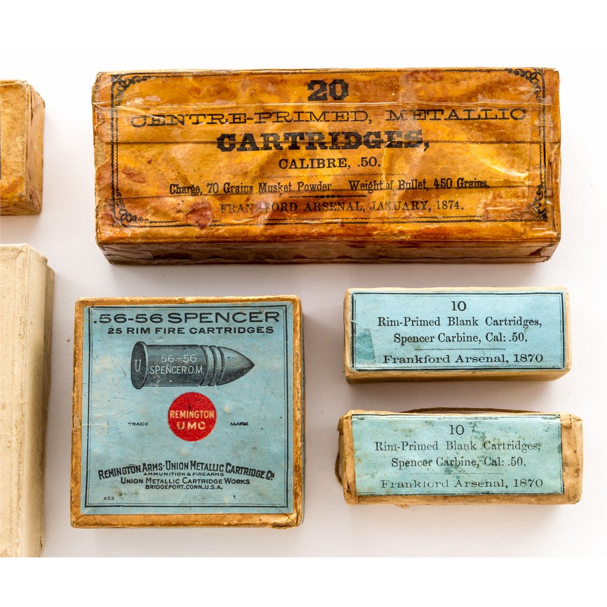 Lot of Four (4) Boxes of Ammunition for Spencer Rifles: (1) Blue box by Remington-UMC, 25 rounds, marked ''Black Powder''. (2&3) Two sealed 1870 dated 10-round packets, with blue labels from the Frankford Arsenal. (4) 42-count box, by Sage Ammunition, with green label. Along with two (2) Frankford Arsenal packages, one for Colt revolver cal. 45, 12 rounds; the other for .50-70, both dated Jan. 1874. All are in very good to fine condition with some losses and scuffing to labels. Est.: $750-$1,000/lot.