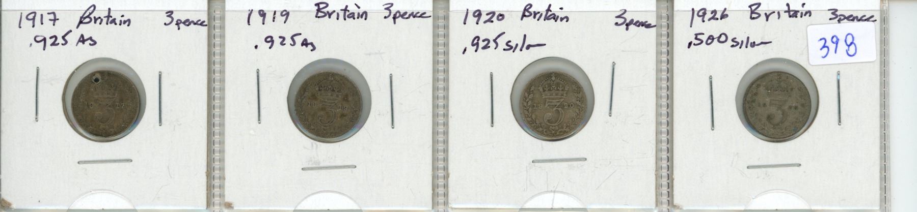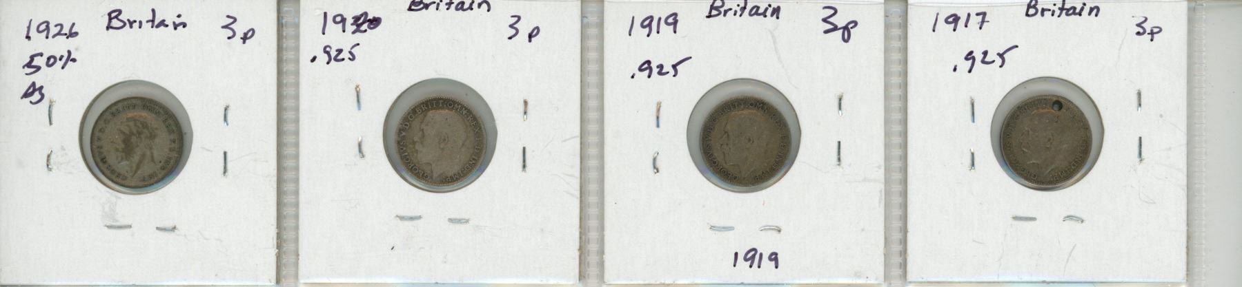 Lot of 4: Britain Silver 3 Pence 1917, 1919, 1920 & 1926