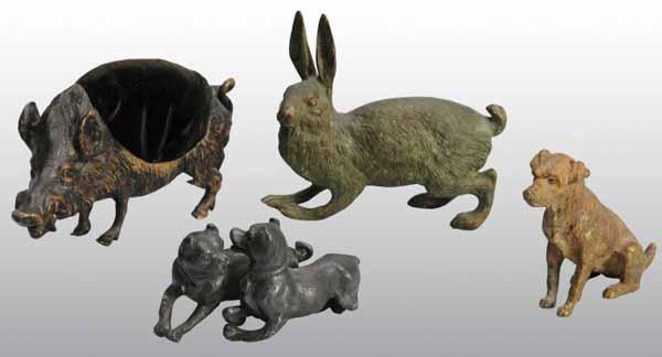 Description Includes one sitting dog, one depicting a pair of dogs frolicking, one boar pin cushion, and one rabbit. Condition (Excellent). Size Largest: 4 - 1/4" L.
