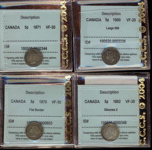 Lot of 4 CCCS graded Five cents; 1870 FB VF30, 1871 VF30, 1892 Obv.2 VF30, 1900 Round O VF20. All toned.