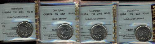 Lot of 4 CCCS graded Twent-five cents; 2004 Red Poppy, 2005 Veteran, 2005 Sask Centennial (2). All