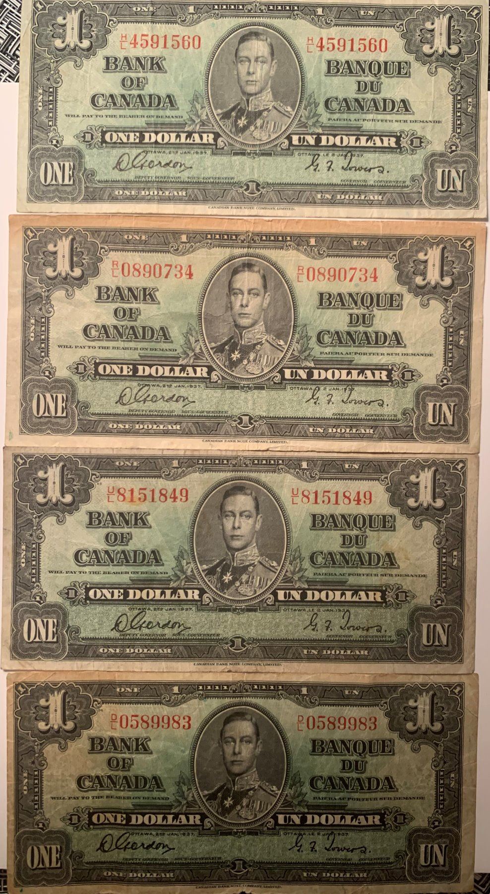 Lot of 4 Canada 1 Dollar 1937 Bank of Canada $1 BC-21c Circulated