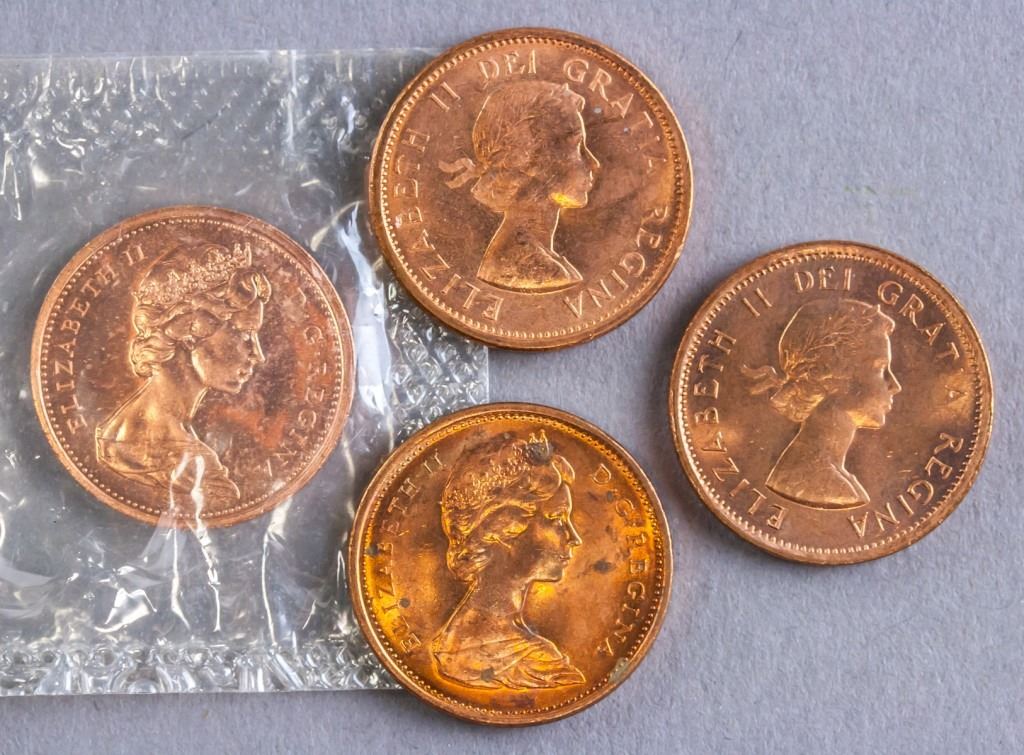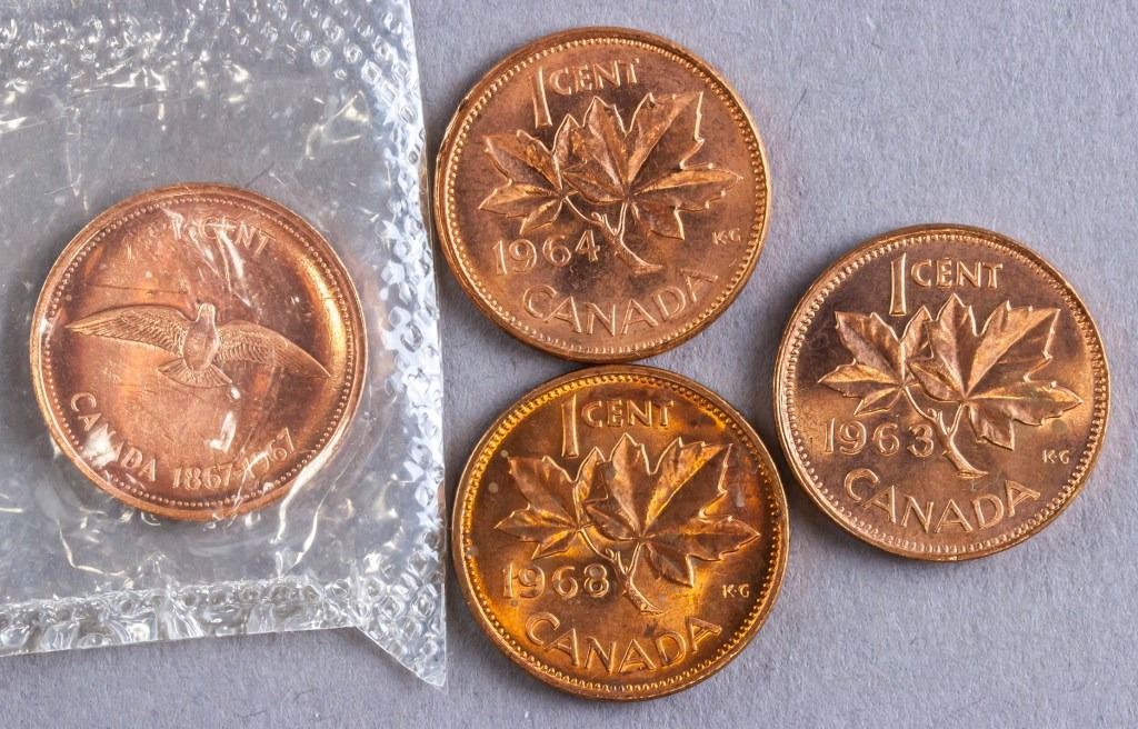 Lot of four Canadian coins. Of 1 cent denomination. Of years 1963, 1964, 1967, and 1968. 1937 coin is a commemorative issue for Canada's centennial. Featuring rock dove in flight. Diameter: 2 cm. 14 grams (total).