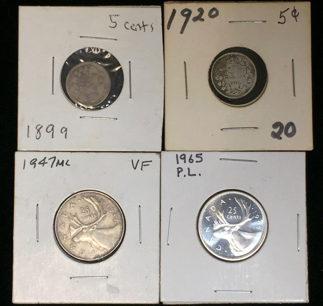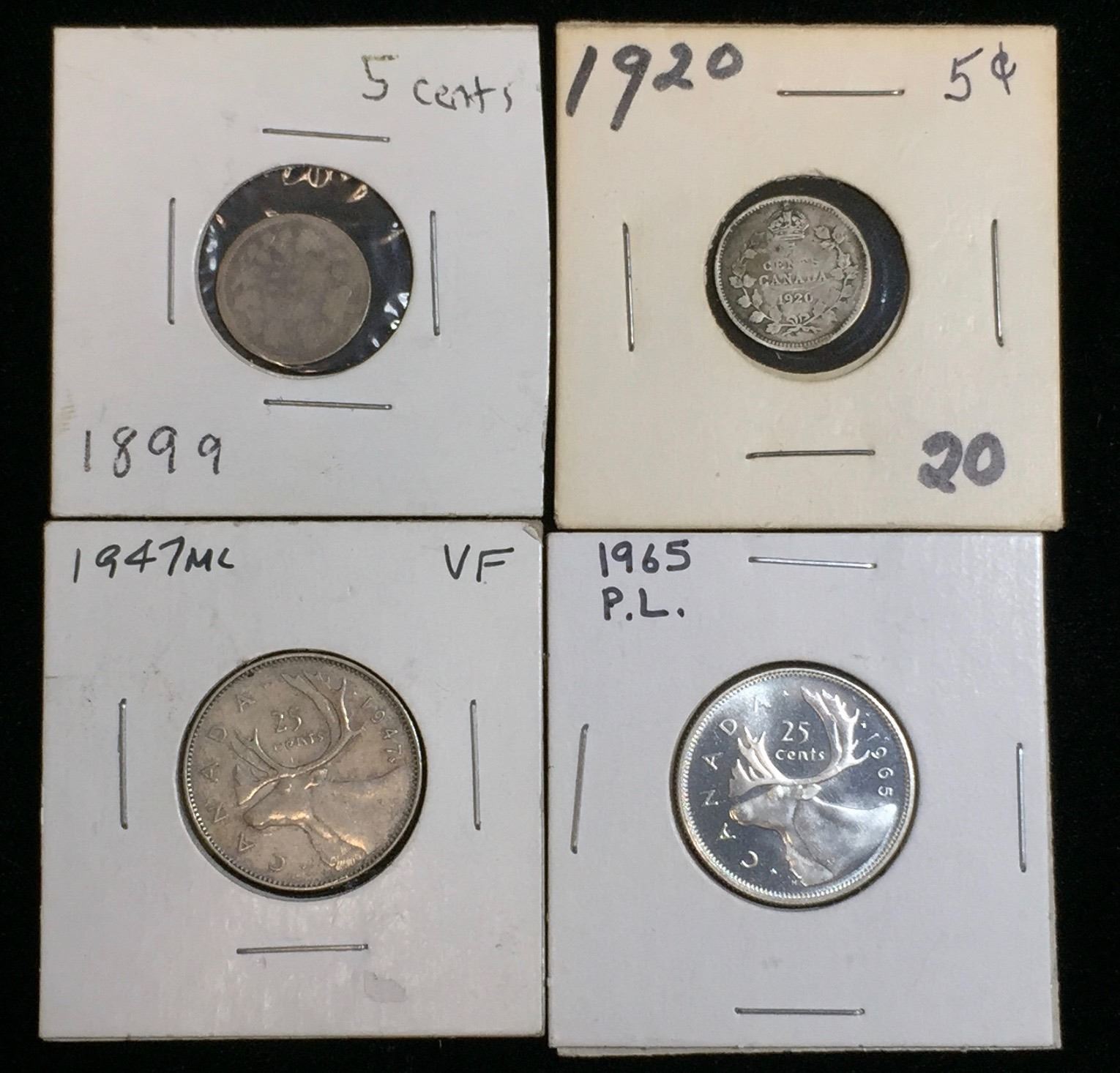 Lot 92; Silver Lot of 4 - Canada Silver 5-Cents 1899 Queen Victoria Effigy, 1920 King George V Effigy & 25-Cents 1947 Maple Leaf, 1965 Proof-Like