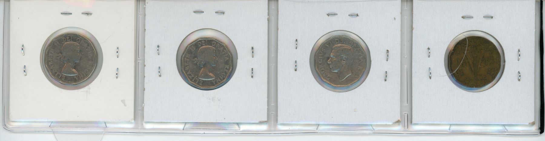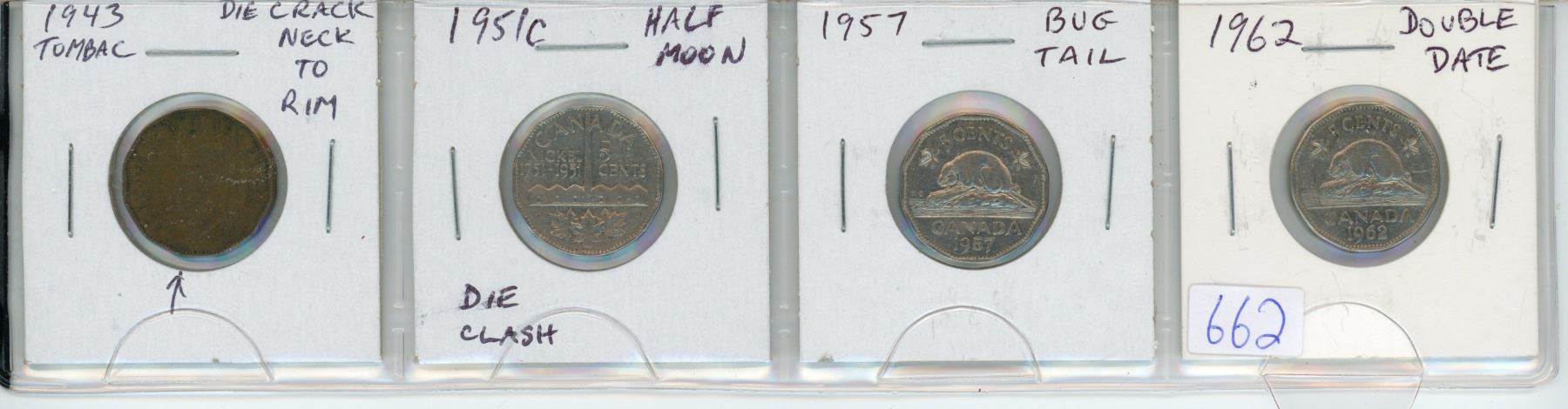 Lot of 4 Canadian Error & Variety 5 Cents. Includes 1943 Tombac with Die Crack from Neck to Rim, 1951c Half Moon from Die Clash, 1957 Bug Tail & 1962 Double Date.