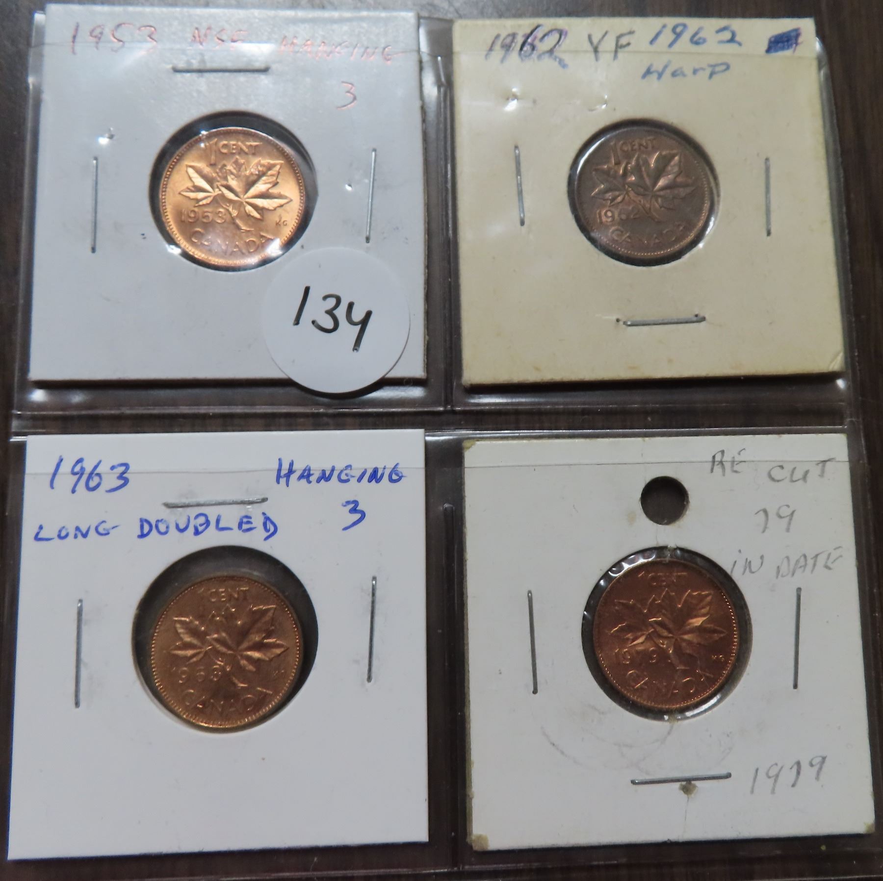 Lot of 4 Canadian Error & Variety Cents. Includes 1953 NSF with Hanging 3 from Die Clash, 1962 Harp, 1963 Long Hanging 3 from Die Clash & 1979 Double Date. Coins grade up to BU Red.