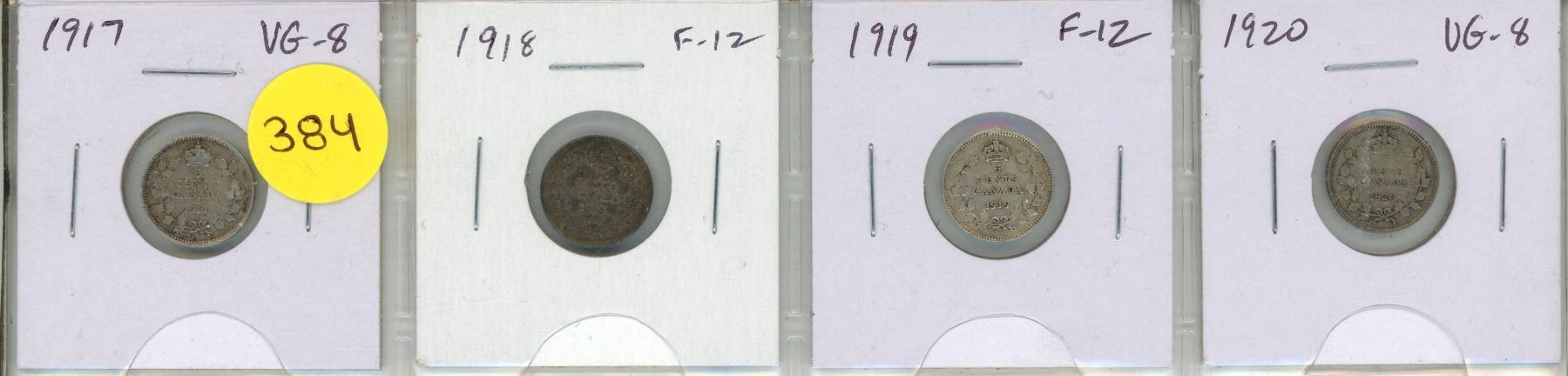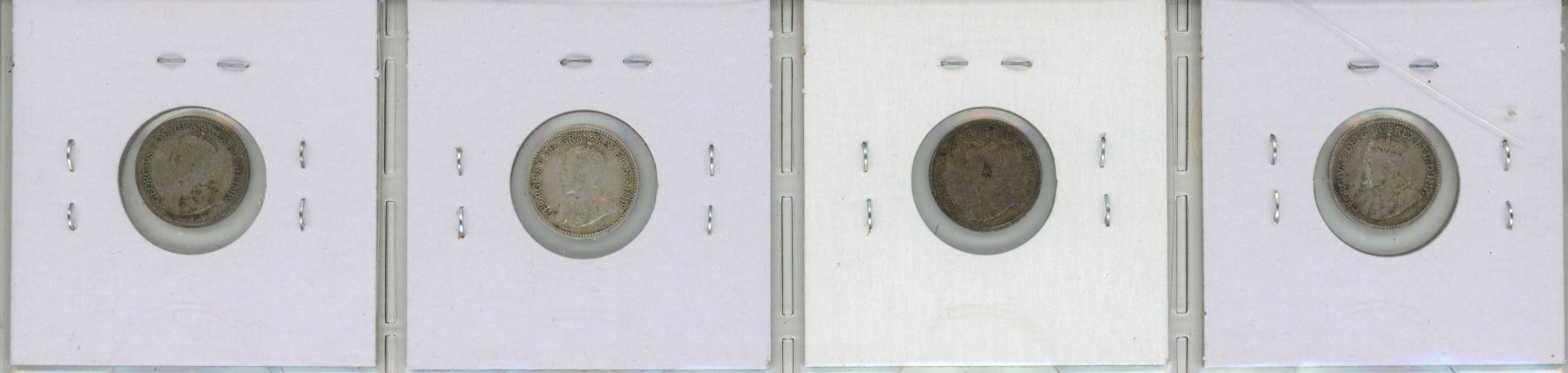Lot of 4 Canadian Silver 5 Cents: 1917, 1918, 1919 & 1920. VG-8 – F-12.