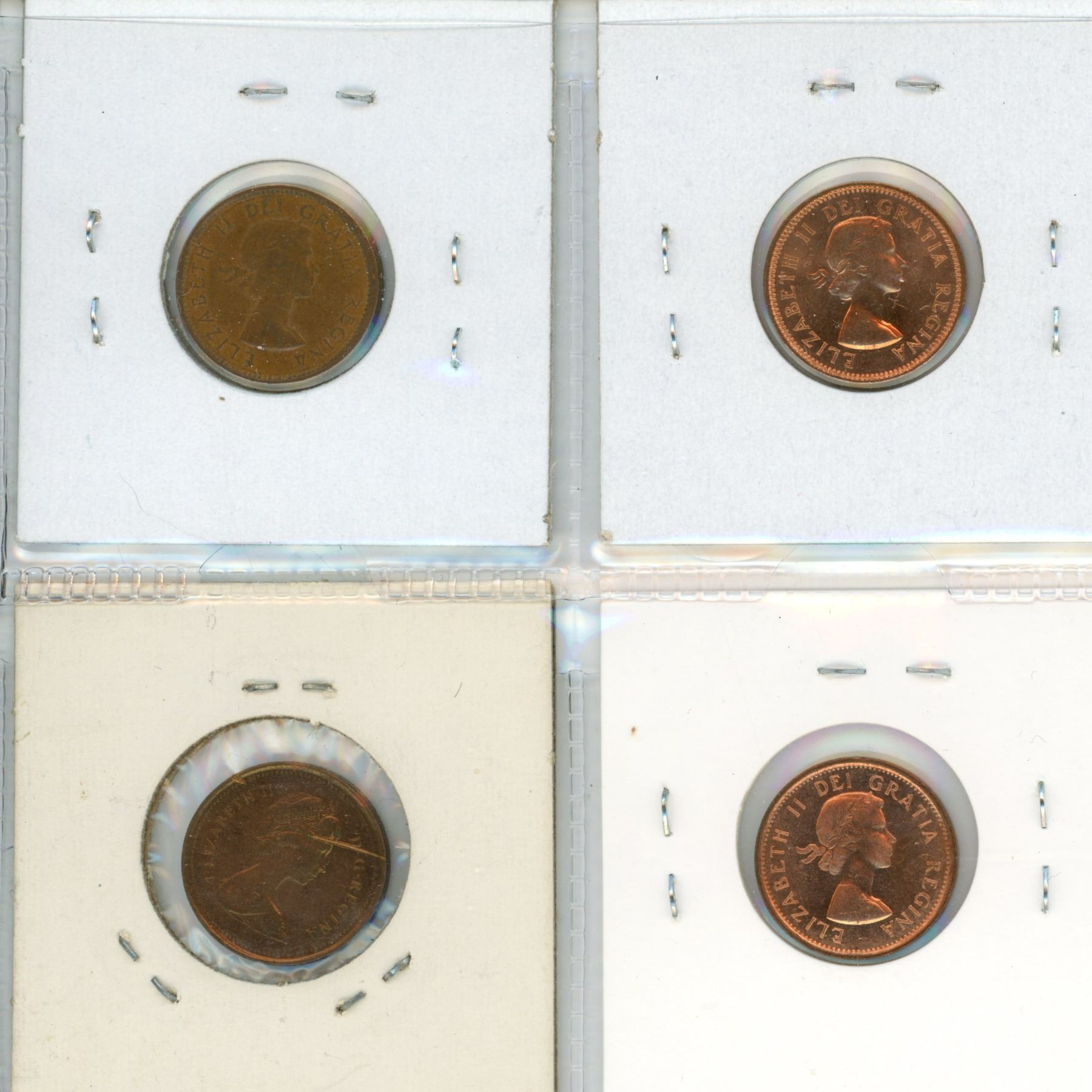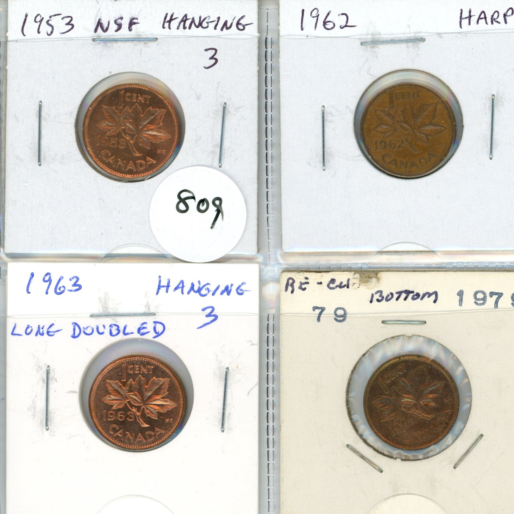Lot of 4 Canadian Small Cent Errors & Varieties. Includes 1953 NSF Hanging 3 from Die Clash, 1962 Harp, 1963 Long Doubled Hanging 3 from Die Clash & 1979 Re-Engraved Date. 3 Coins are BU Red.