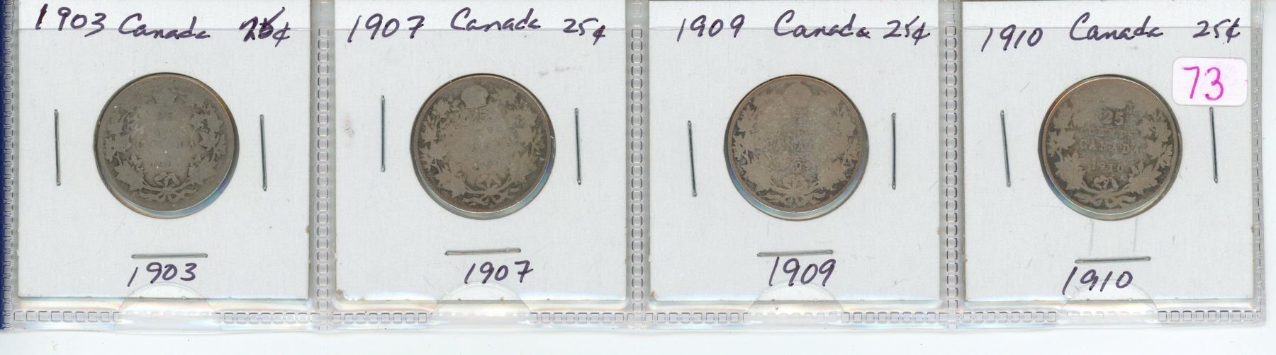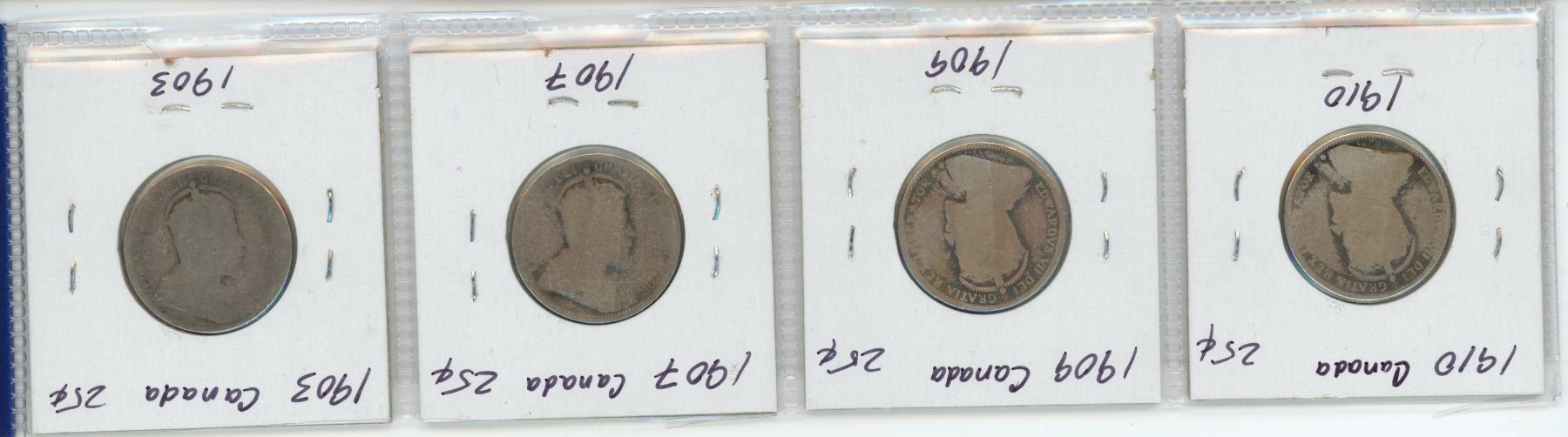 Lot of 4, Canadian silver 25 cent coins - 1903, 1907, 1909-10