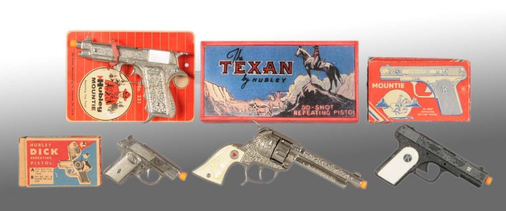 All are working. Includes Hubley revolving Texan gun with reproduction box, Hubley Mountie Pistol on original card, small Hubley Dick Pistol in original box and small Kilgore Mountie Pistol with original box. Cap Gun Condition (Very Good). Size Largest Box: 9 - 1/2" L.