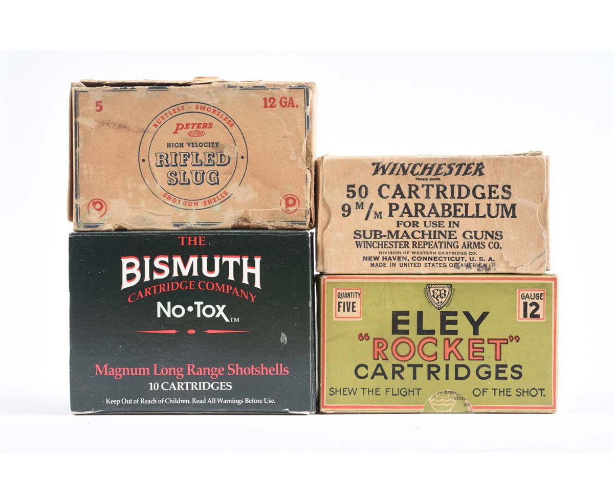 Includes Winchester full box of 50 9mm parabellum for sub-machine guns, Eley Rocket 12 ga box of five seven-shot bullets, Bismuth 10 ga box of ten magnum long range, and Peters box of five 12 ga rifle slugs. Condition (Poor - Excellent).