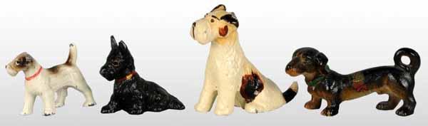 Description Includes one Fox Terrier party favor by Hubley, one Scottie card holder by Hubley, cat. #439, one lead Wirehaired Terrier, and one Dachshund party favor by Wilton. Condition (Excellent).
