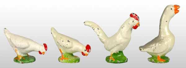 Description Includes one rooster, two hens, and one goose. Condition (Excellent). Size Largest: 1 - 7/8" T.