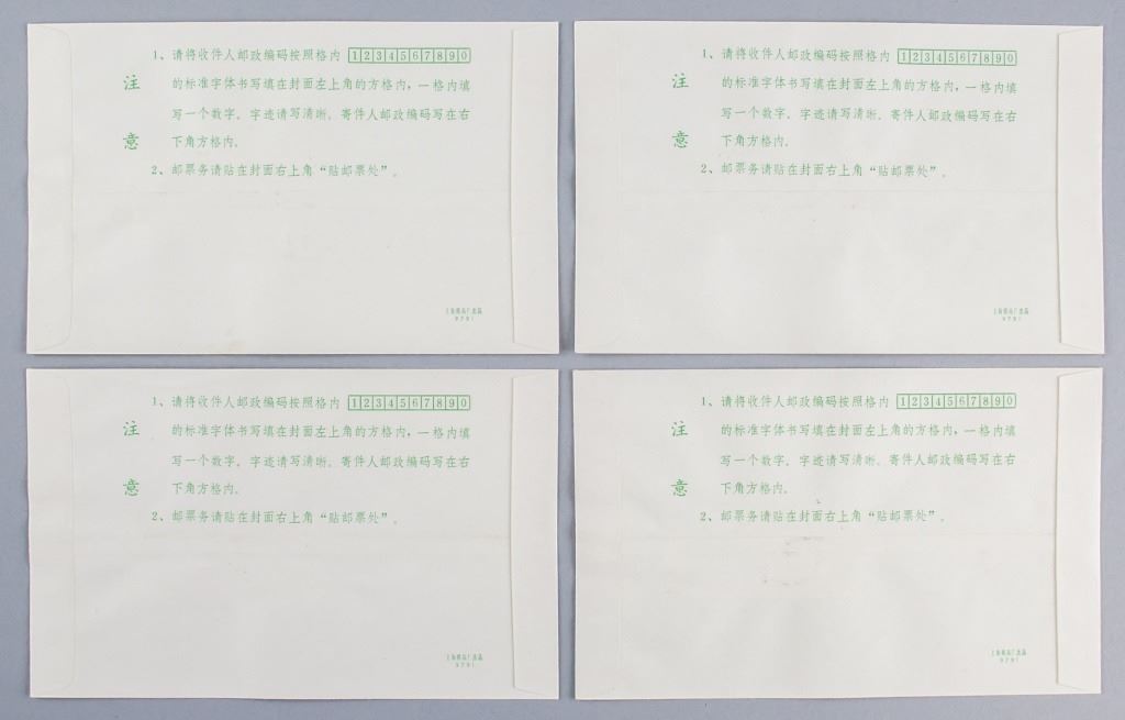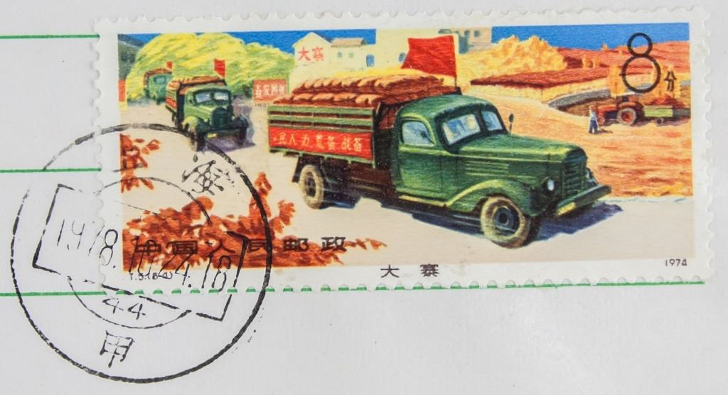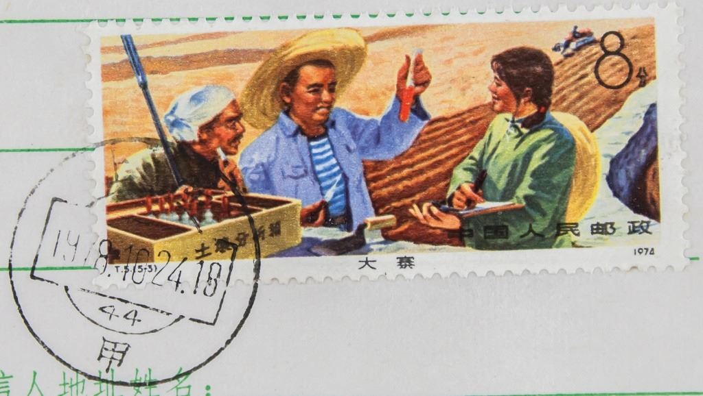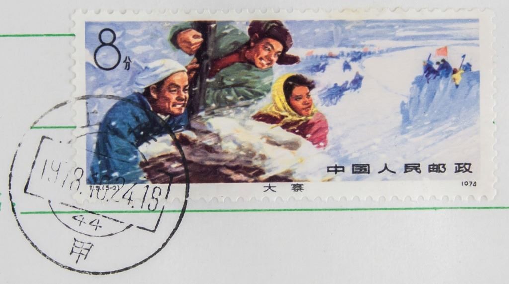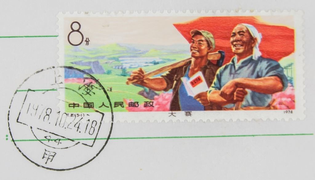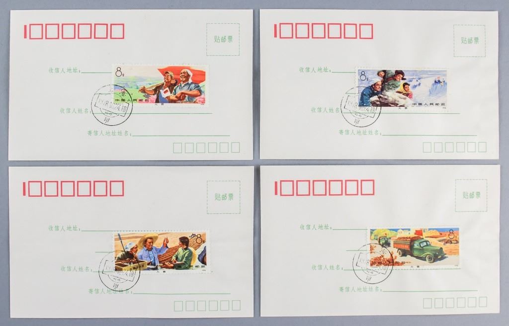 Lot of four Chinese stamps. Featuring smiling workers and other propaganda images. Issued in 1974. Of value 8 cents.