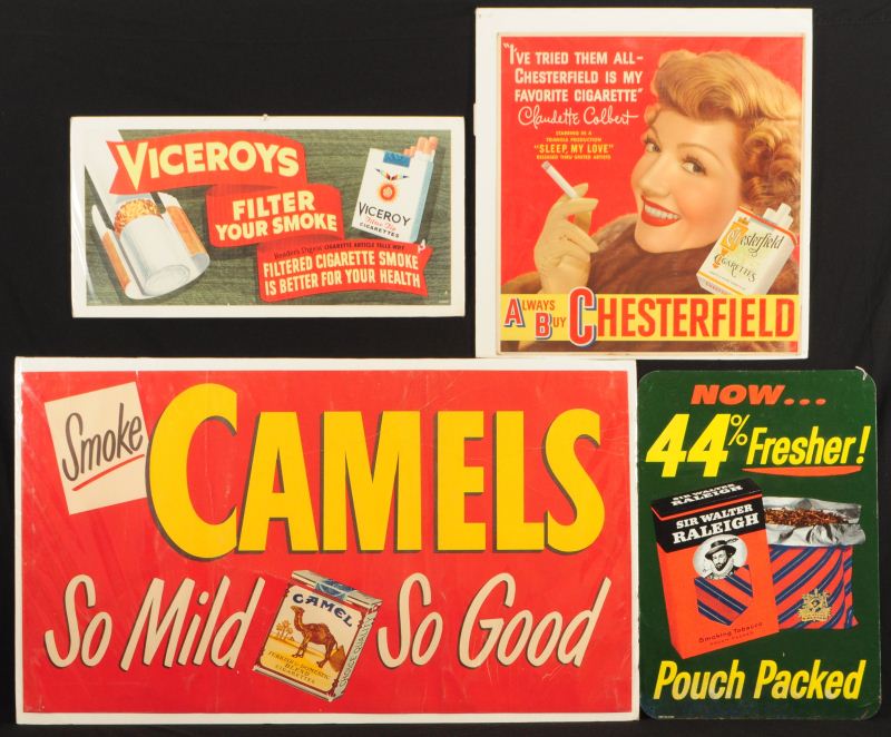 Lot of 4 Cigarette Advertising Posters, Three are Posters and One is a Tin Advertising Piece, Largest Poster Measures 42" x 24" Tin Measures 24" x 16"