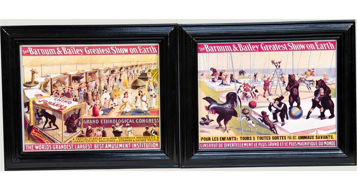 Lot of 4 Circus Poster Prints In Matching Frames: 1 - The Barnum & Bailey Greatest Show on Earth French Print, "Pour Le Enfants...L'Institut De Divertissement", 1 - The Barnum & Bailey Greatest Show on Earth Grand Ethnological Congress, "A Partial Display of the New Enormous Menagerie & Characteristic Groupings of Strange & Savage People" copyright 1894 Strobridge Lith. Co., 1 - Ringling Bros. And Barnum & Bailey Combined Shows, "A New Jungle Circus - A Complete Big Trained Animal Show Gratuitously Added" featuring lions & 1 - The Barnum & Bailey Greatest Show on Earth The Rival Riders, "Wm. Showles - Wm. DeMott - The World's Most Famous Equestrians in Daily Contest for Supremacy" - 17" x 14" each