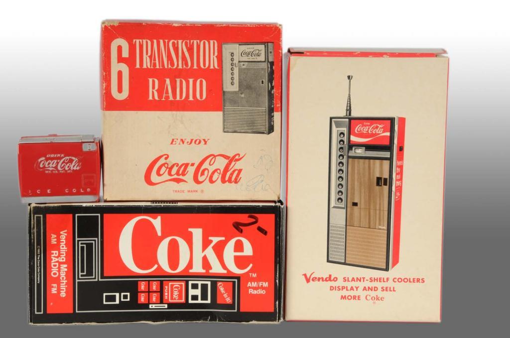 Includes three Coca-Cola 1950s to 1970s transistor radios and one 1950s music box. Two largest radios are mint and in original box while the small transistor and music box are used with some wear. Condition (7.0 - 9.5, Very Good - Near Mint). Size Largest: 9 - 1/2" T.