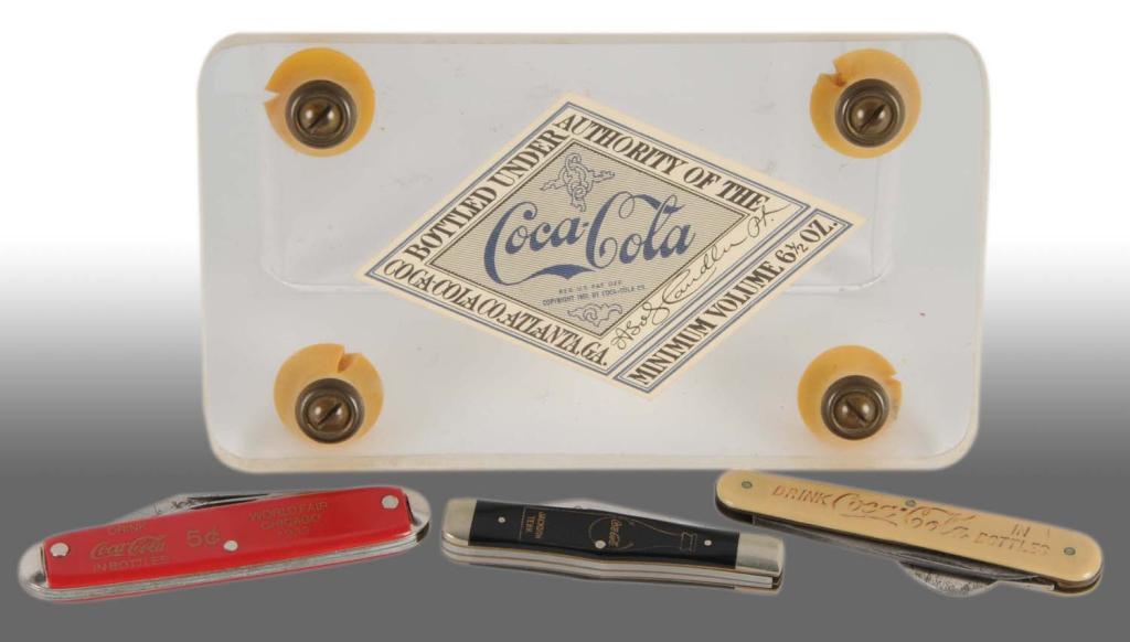 Description Includes three pocketknives and one reproduction diamond label. Only medium wear to two knives while the other two pieces have little to no wear. Condition (8.5, Excellent).
