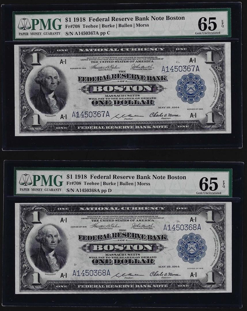 One Lot of (4) Consecutive 1918 $1 Federal Reserve Bank Notes Boston PMG 65/66EPQ. PMG Certified.