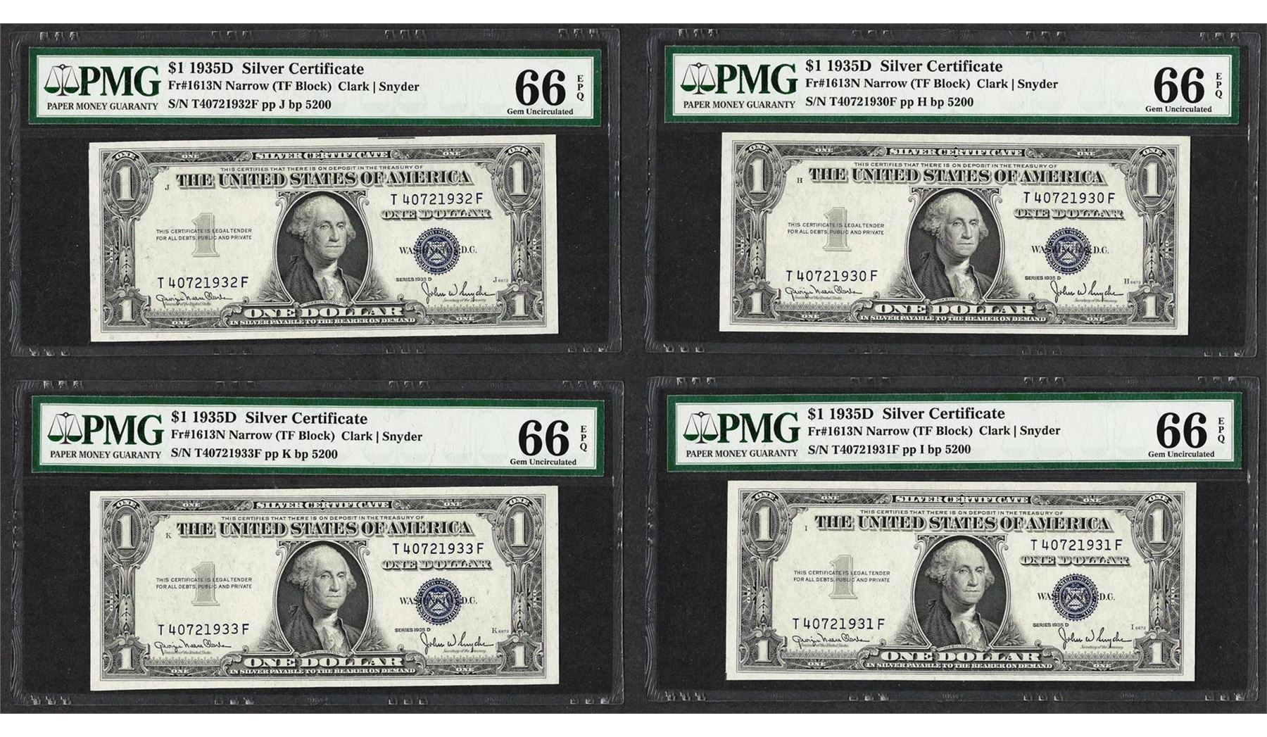 One Lot of (4) Consecutive 1935D $1 Silver Certificate Notes PMG Gem Uncirculated 66EPQ. PMG Certified.
